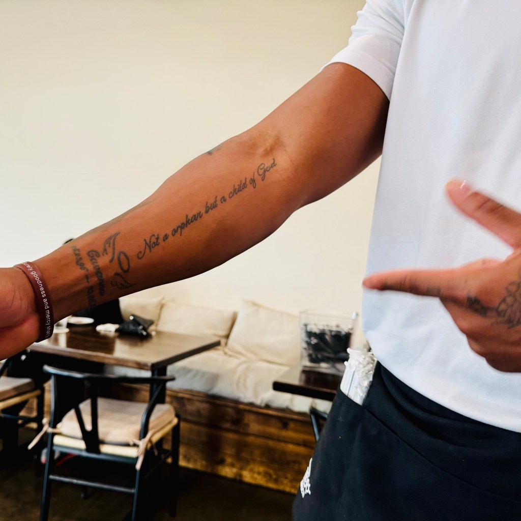 Then he showed us the one he was most proud of. On the inside of his arm, simple but striking: “Not a orphan but a child of God.”